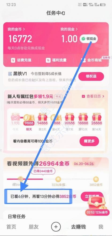 然后返回首页,看视频5分钟后点页面红包进去截图。