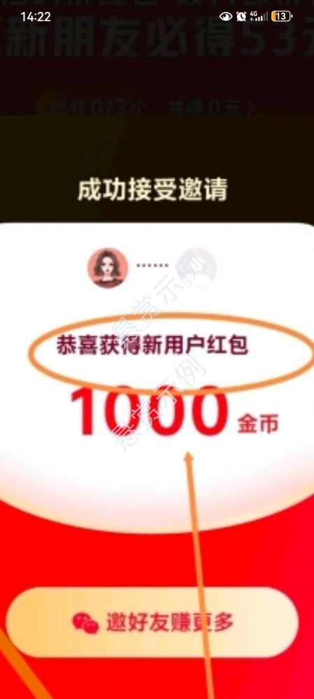 扫码后显示“新用户1000金币”截图。必须有“新用户”字样,其他一律不合格,助力成功的是老用户。
